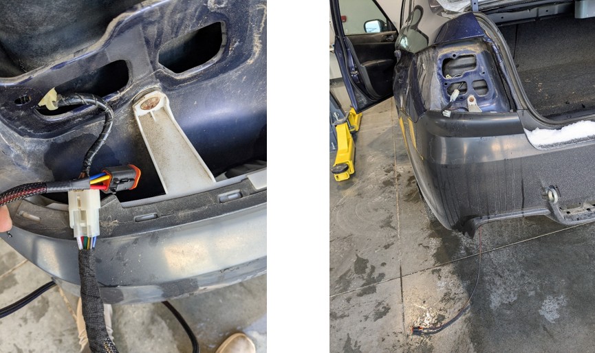 Route the inline harness connector downward behind the rear bumper, feeding it toward the lower bumper opening.