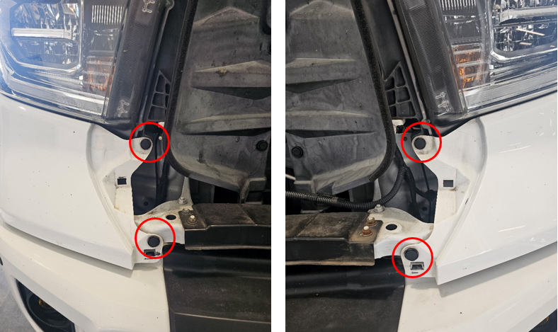 Remove the two 12mm bolts and two 10mm bolts on each side underneath the bumper.