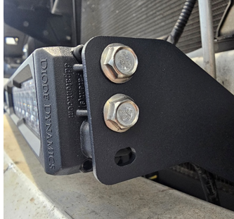 Using the included hardware from the lightbar kit and a 10mm wrench, secure the SS40 lightbar to the brackets. Orient the lightbar so the harness exits on the driver side. Leave the mounting hardware slightly loose until the bar is level and centered.