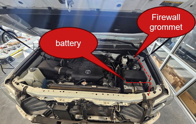 Connect the lightbar to the wiring harness and route the switch lead through a factory firewall grommet into the cabin. Make sure the grommet seals around the wiring to prevent water intrusion. Connect the power leads to the battery and mount the switch in a convenient location inside the cabin.