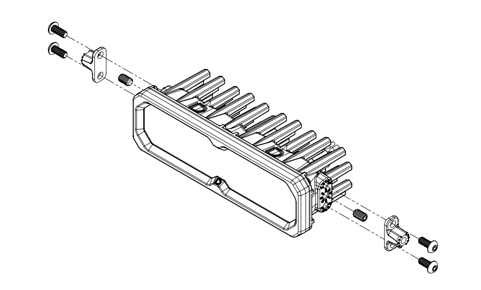 Install the included set screws in the center mounting position on both sides of the lightbar. Then, attach the adapter to the lightbar using the included Torx screws in the top and bottom mounting holes. Once the adapter is secured, use the supplied hex bolt to mount the lightbar to the main mounting bracket as normal.