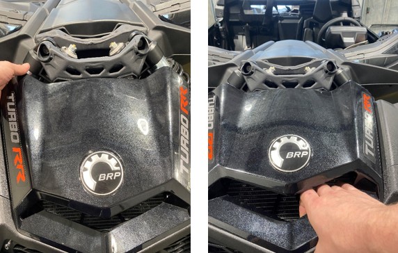 With a firm tug, pull the top-left side of the hood up and away from the vehicle. Work your way around until all five attachment points are released, then set the hood aside for reinstallation later.