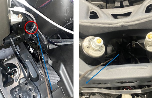 Take the harness you routed through the firewall and insert it through the gap on the right side near the bracket area.