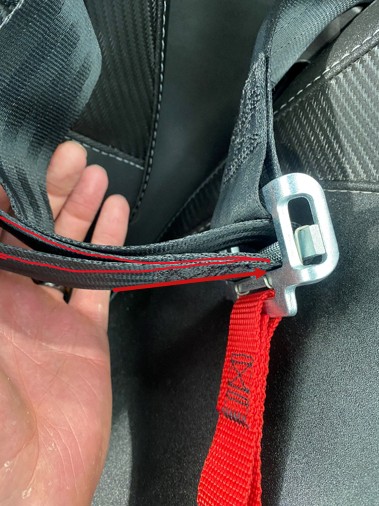 Disconnect the seatbelt from the base of the passenger seat by pulling the looped end through and out of the harness.