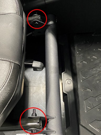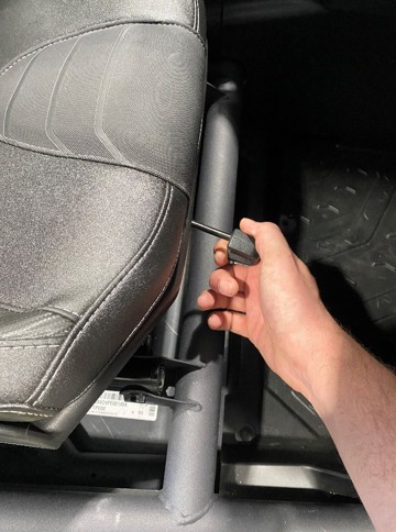 Adjust the passenger seat all the way forward by pulling the lever towards you and pushing the seat up to access the rear mounting hardware.