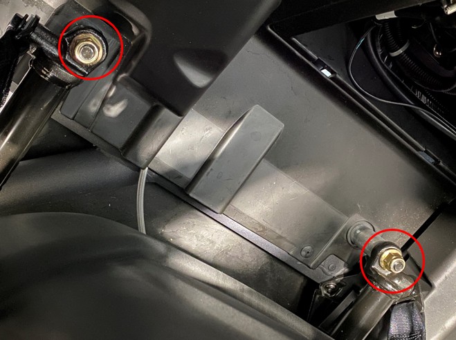 With the seat pushed forward, reach behind the seat and use an 18mm socket and ratchet to remove the two rear gold locking nuts.