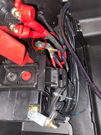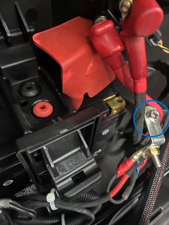 Using a 10mm socket or wrench, disconnect the positive (red) battery lead to prevent accidental shorts while installing the relay. Secure the lead away from the terminal.