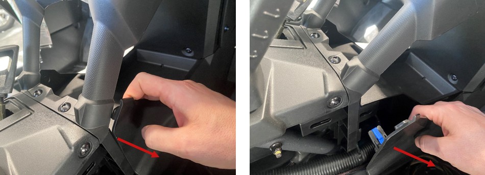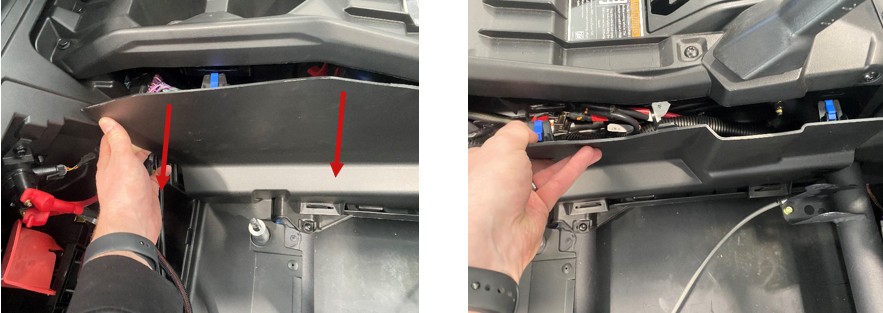 To access the busbar, remove the passenger side console panels. Carefully pull away the top-left corner to release the clips, then work your way toward the front until the panel is fully released. Set it aside for reinstallation later.
