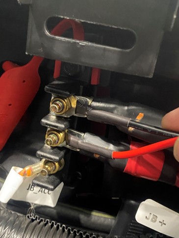 Peel back the rubber protective covering to access the busbar. Using a 10mm socket and ratchet, loosen the top two bolts to prepare for relay installation.