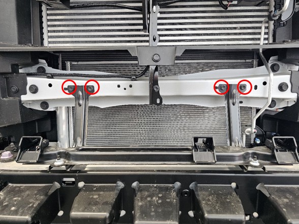 Using a 10mm socket with a 10" extension, remove the four bolts located behind the lower grille.