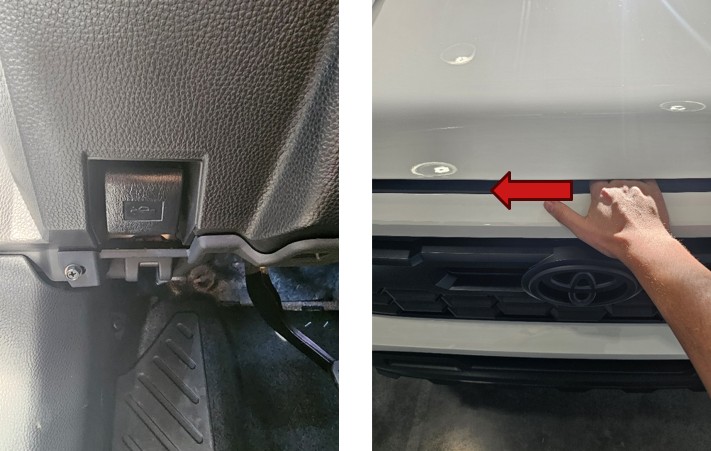 Locate the hood latch inside the vehicle and pull to release the hood. Slide your hand from right to left to release the safety lock and open the hood.