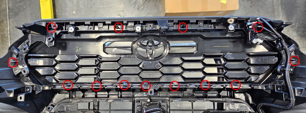 Install the new TRD Pro grille by reversing the previous steps. Reconnect the front camera if equipped.