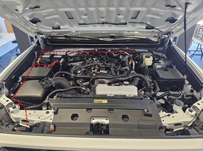 Route the main wiring harness through the engine bay toward the battery and firewall.