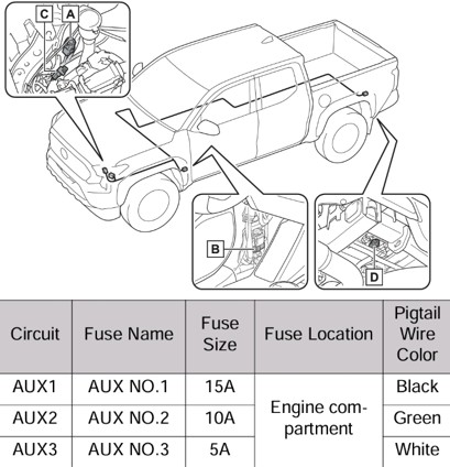 If equipped with factory auxiliary outputs, you can replace the 3-position rocker switch on the DD4104 harness with the included AUX Switch Extension. Behind the driver's side headlight is a factory pigtail. We recommend attaching the blue wire on the AUX extension to AUX3 (White) and the yellow wire on the AUX extension to AUX1 (Black) or AUX2 (Green).
