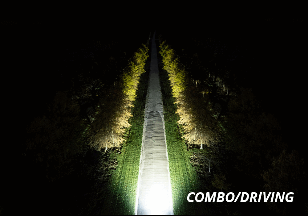 The all-new Combo/Driving pattern has been engineered to blend distance and width into one balanced beam pattern. Everyone wants a great all-around light, and while other options on the market try to tackle this by combining two patterns, the resulting output is less than desirable–spot gives you a harsh hotspot, while a flood or wide pattern produces unwanted glare and wasted light. Our new Combo/Driving optic uses dozens of carefully-designed pillow optics to produce a blended, even output that measures 60x30 degrees and gives you throw downrange while still providing ample foreground illumination. It’s the ideal choice when you want one bar that can handle just about any situation, and it elevates the standard for what a Combo light should be.